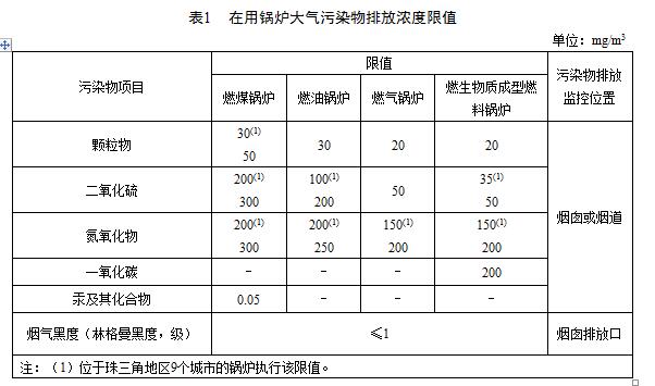 二、在用鍋爐自2019年7月1日起執(zhí)行表1規(guī)定的大氣污染物排放限值,自2020年7月1日起執(zhí)行表2規(guī)定的大氣污染物排放限值。